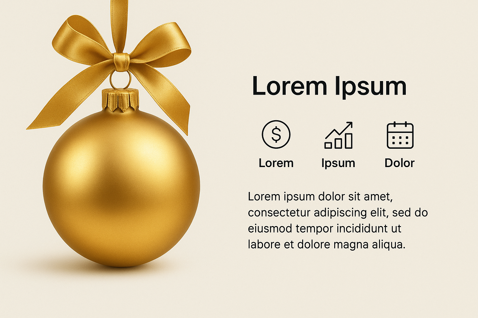 Stylish graphic featuring a golden Christmas ornament with a ribbon, accompanied by text boxes, ideal for holiday-themed promotions or announcements.