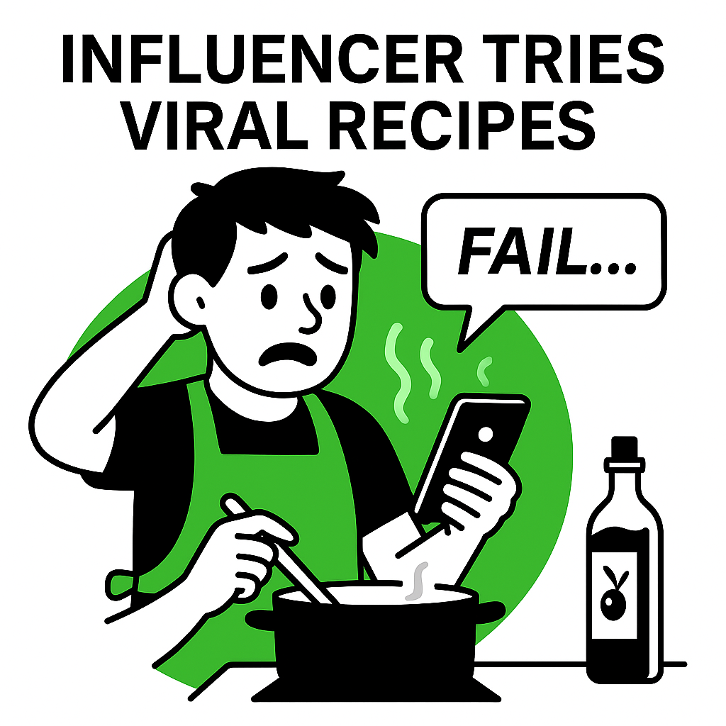 /Collection: /by davooda/Type: PNG/A cartoon-style graphic depicting a distressed influencer attempting viral recipes, showcasing a humorous take on cooking mishaps. Ideal for social media or blog content.