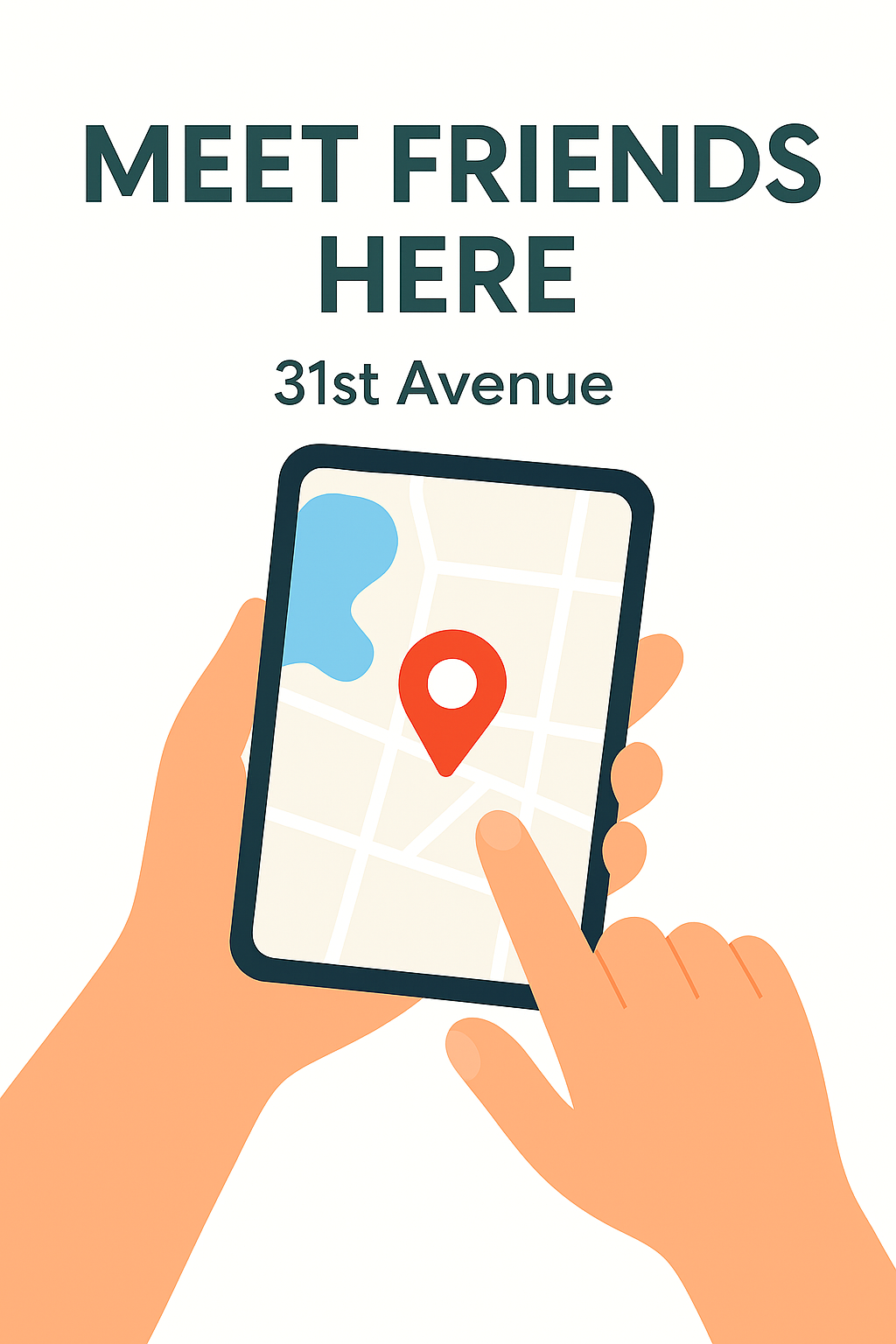 A vibrant graphic showing a hand holding a smartphone displaying a map with a location pin, ideal for social media invitations or event promotions.