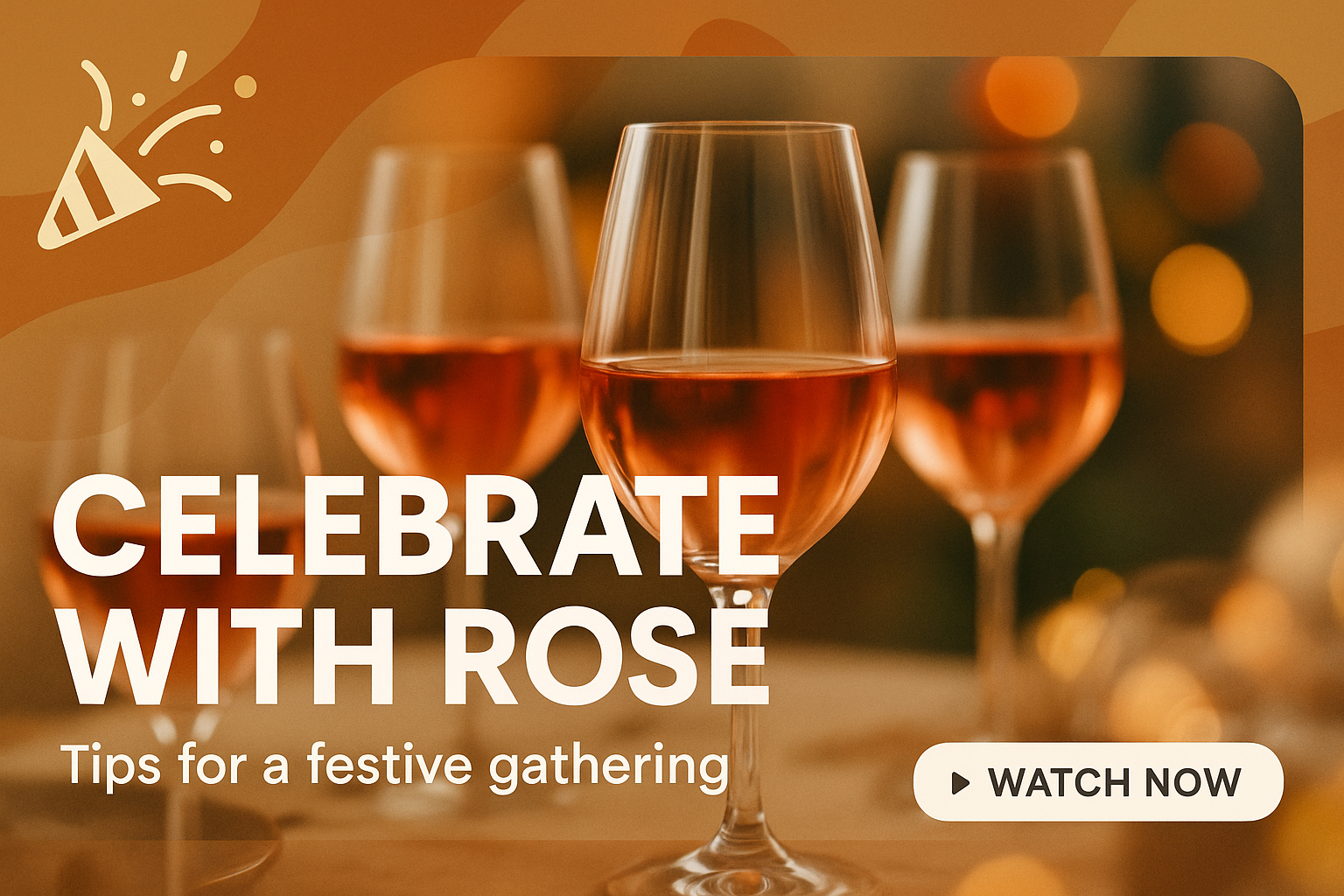 A visually appealing graphic promoting a festive gathering with rose wine. The warm colors and elegant design create an inviting atmosphere, ideal for social media or event promotion.