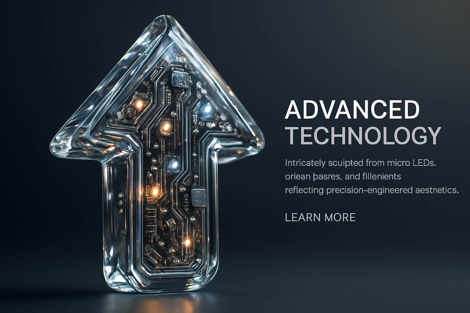 /Collection: /by davooda/Type: PNG/A stunning 3D hyperrealistic arrow sculpture made from clear polymers, showcasing a detailed inner world of glowing micro-LEDs and intricate circuit boards, enhanced by elegant lighting.