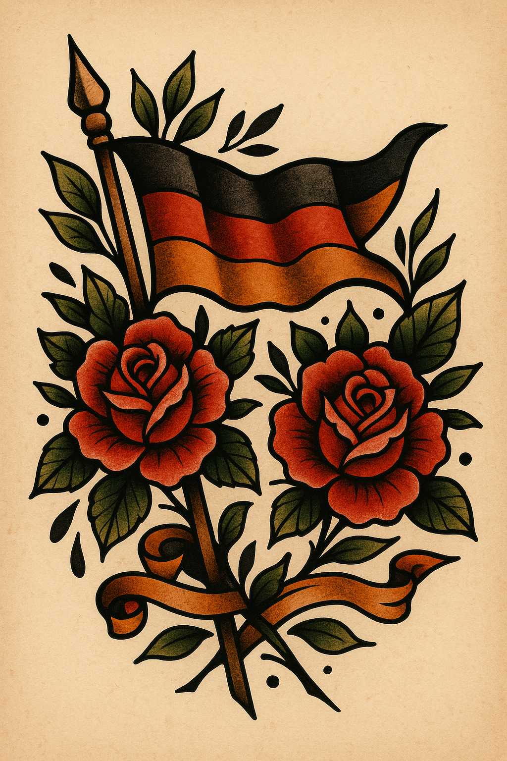 /Collection: /by davooda/Type: PNG/This image represents a traditional tattoo design featuring the German flag and red roses. It utilizes bold colors and a vintage style, ideal for tattoo enthusiasts.