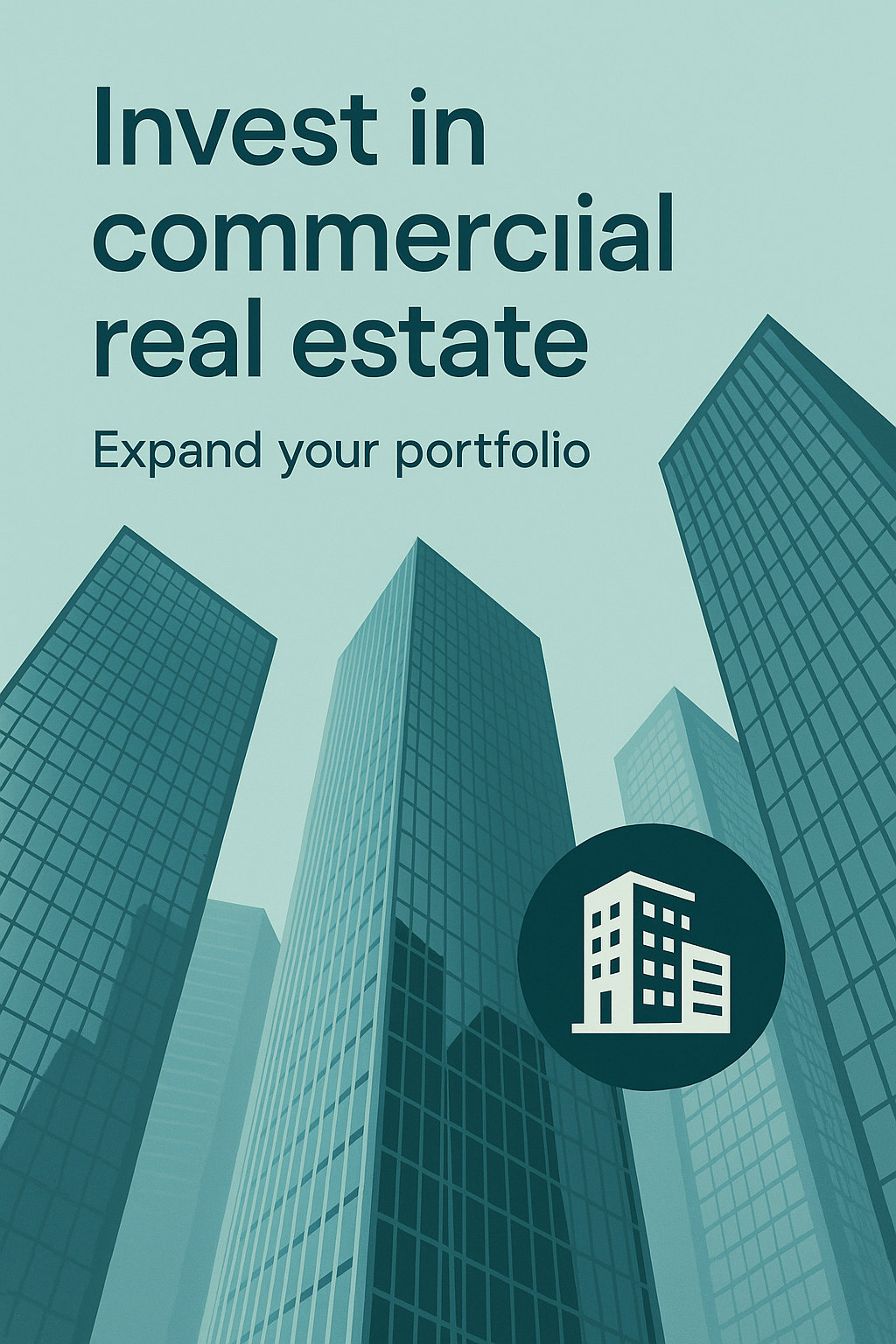 /Collection: /by davooda/Type: PNG/A modern promotional graphic highlighting investment opportunities in commercial real estate, featuring sleek skyscraper visuals and a professional design suitable for financial marketing.