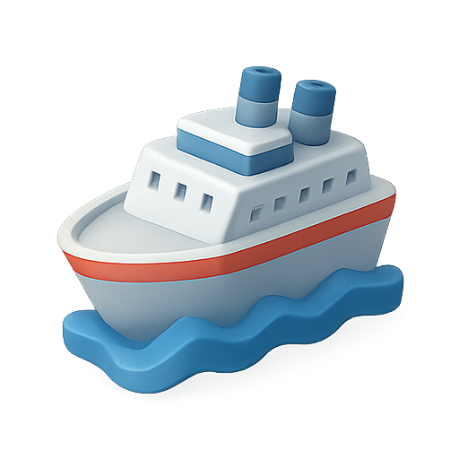 A playful 3D rendered boat icon featuring a cartoonish design with soft colors and waves, suitable for maritime themes, apps, or educational materials.