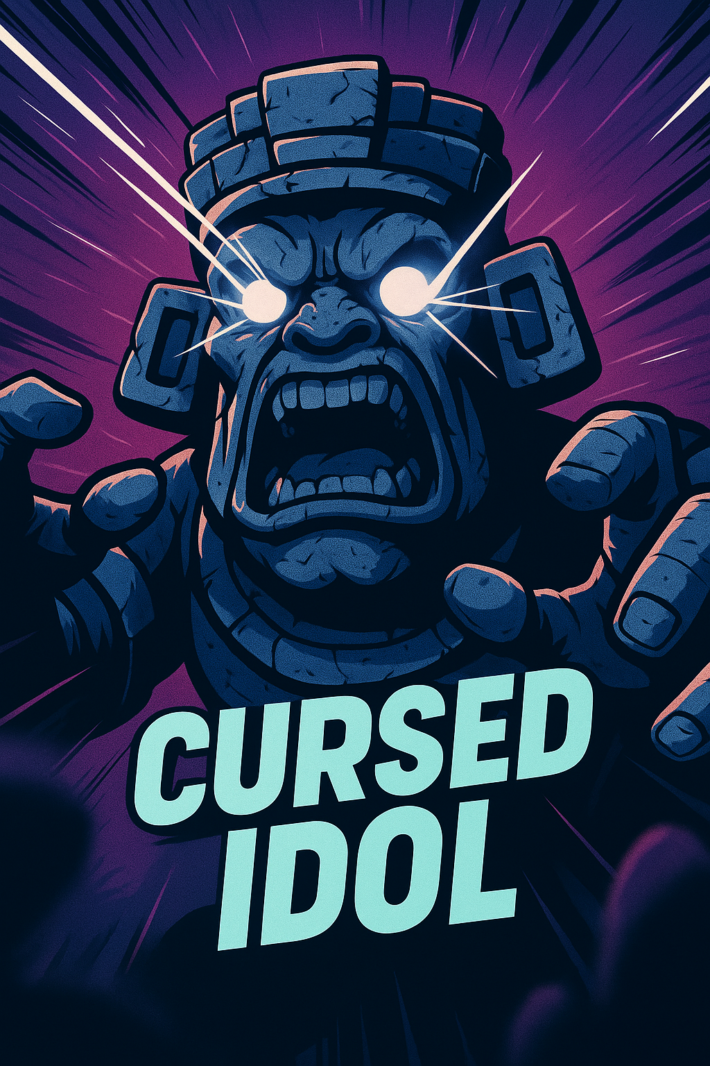 A striking 3D illustration of a cursed idol with dynamic rays emanating from its center. The bold title 'Cursed Idol' is prominently displayed, enhancing the dramatic effect.