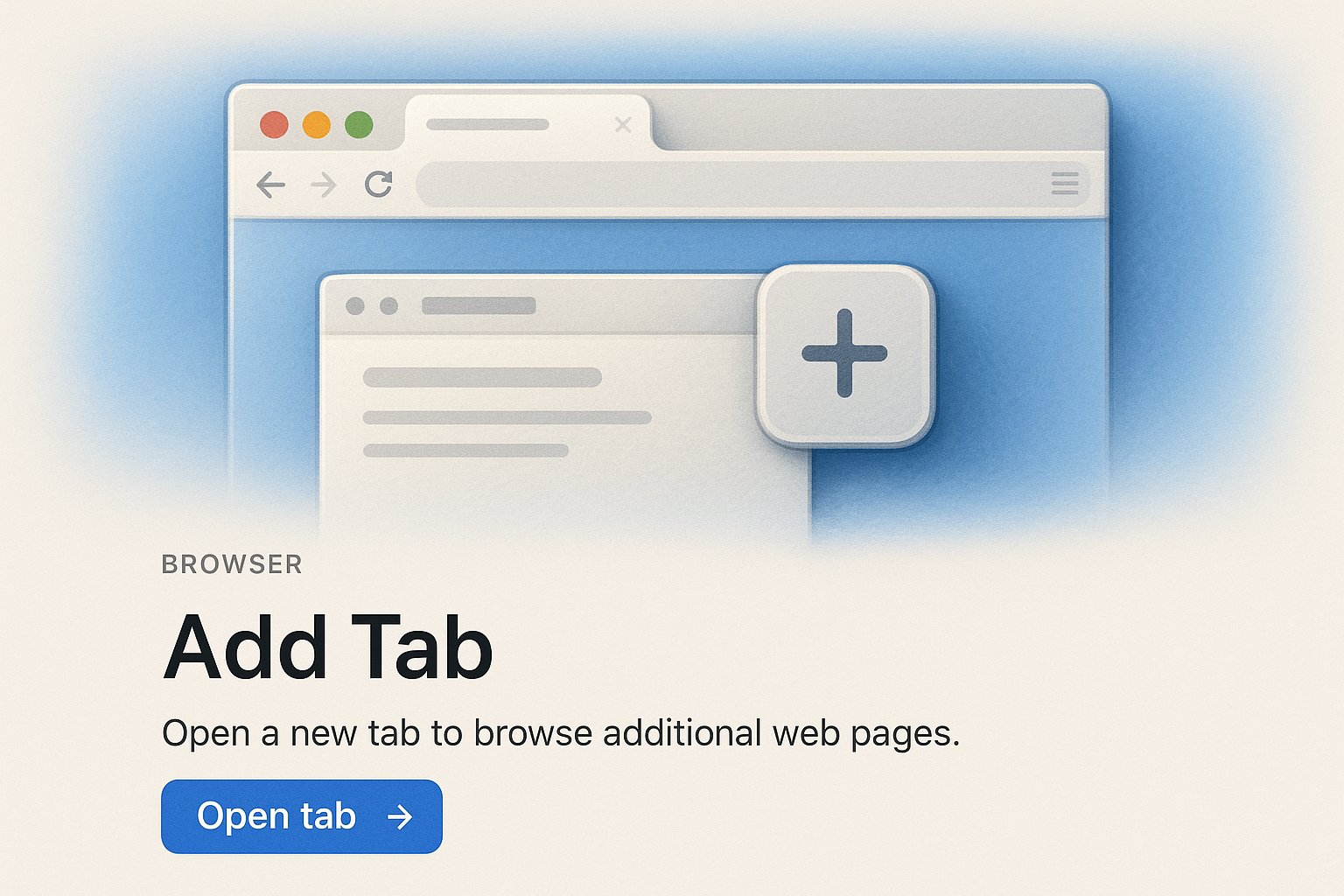 A sleek web page design featuring an 'Add Tab' button. The layout includes a browser window, a clear action button, and minimal text for user interaction.