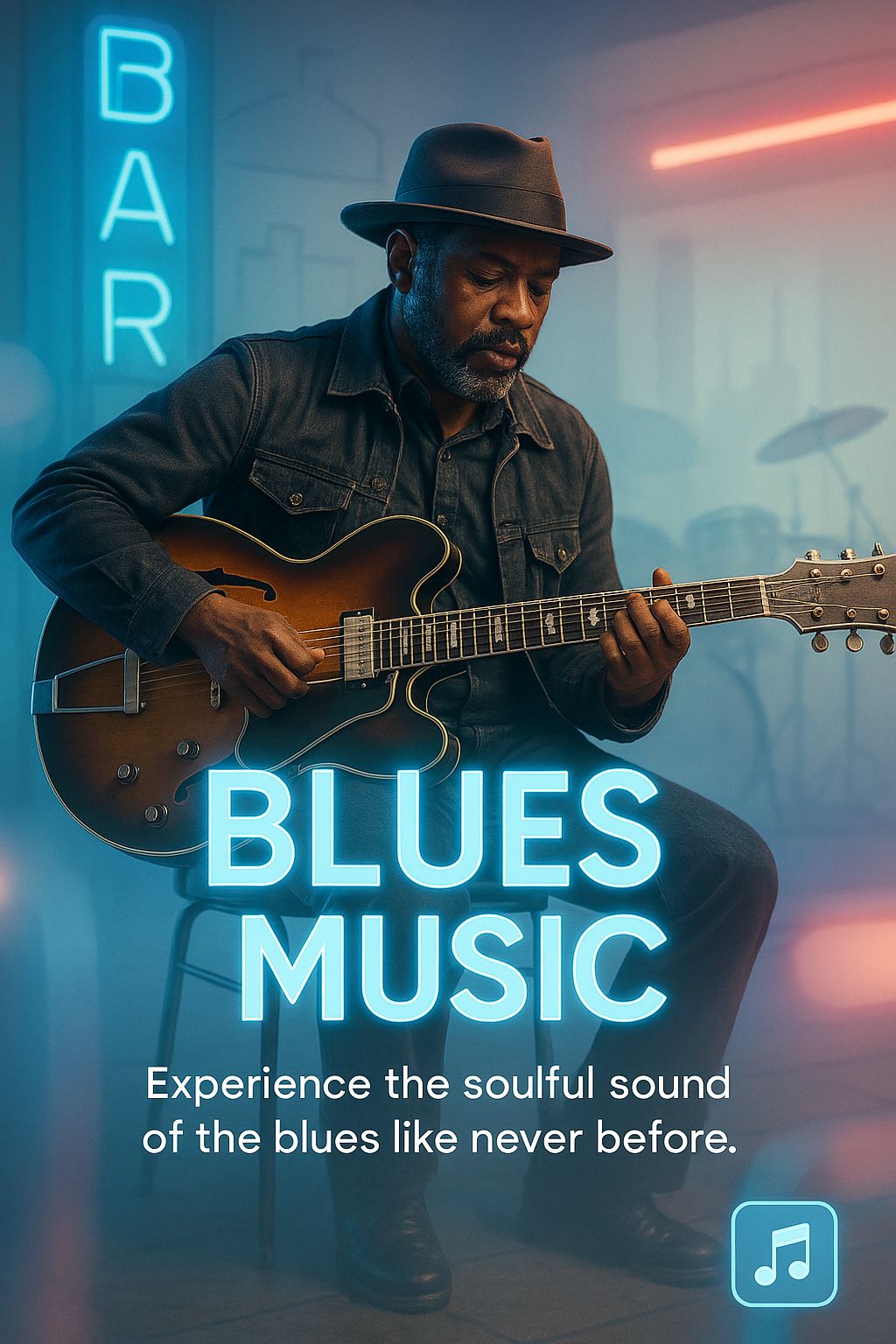 /Collection: /by davooda/Type: PNG/Engaging promotional image showcasing a musician playing guitar in a bar setting, ideal for advertising blues music events or albums. The modern design features vibrant neon elements.