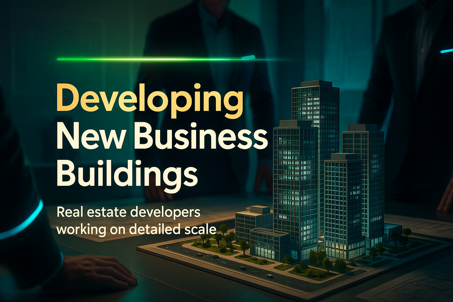 /Collection: /by davooda/Type: PNG/A visually striking image depicting real estate developers engaging with a detailed architectural model of business buildings, showcasing a modern and professional atmosphere suitable for real estate marketing.
