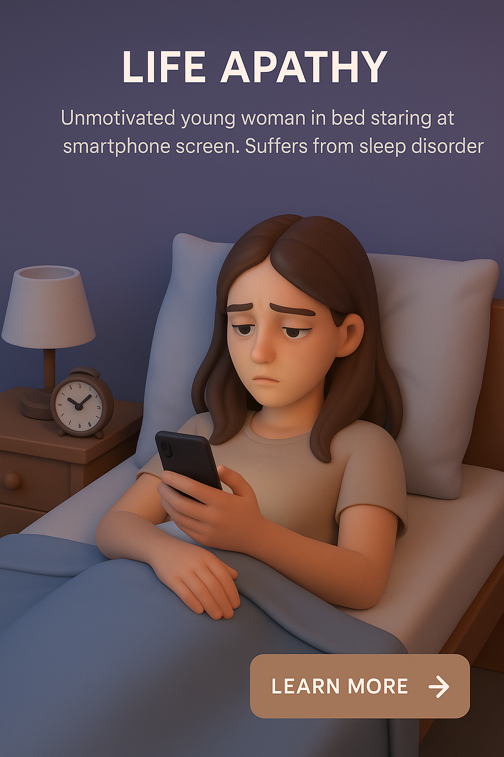 /Collection: /by davooda/Type: PNG/A detailed 3D illustration of an unmotivated young woman in bed, looking at her smartphone. The scene captures feelings of apathy and sleep disorder, with a cozy yet melancholic atmosphere.