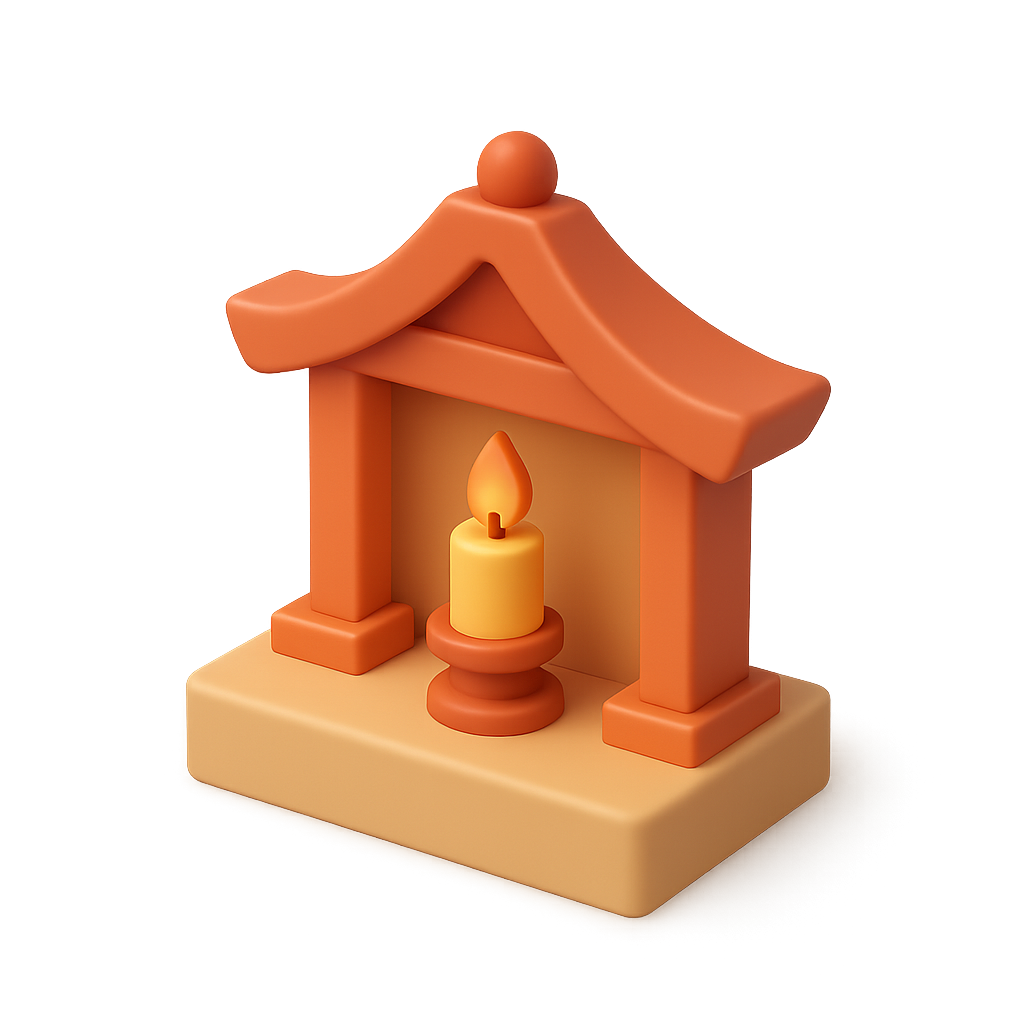 A simple, stylized 3D shrine icon featuring a candle, designed with a three-quarter view. The shrine has a warm color palette, emphasizing a serene worship atmosphere.