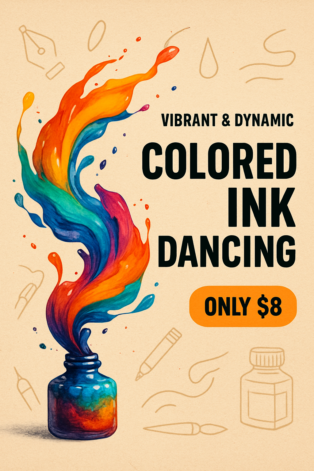An advertisement featuring a vibrant ink bottle with colorful swirls on a textured background. Bold typography emphasizes the product details and pricing.