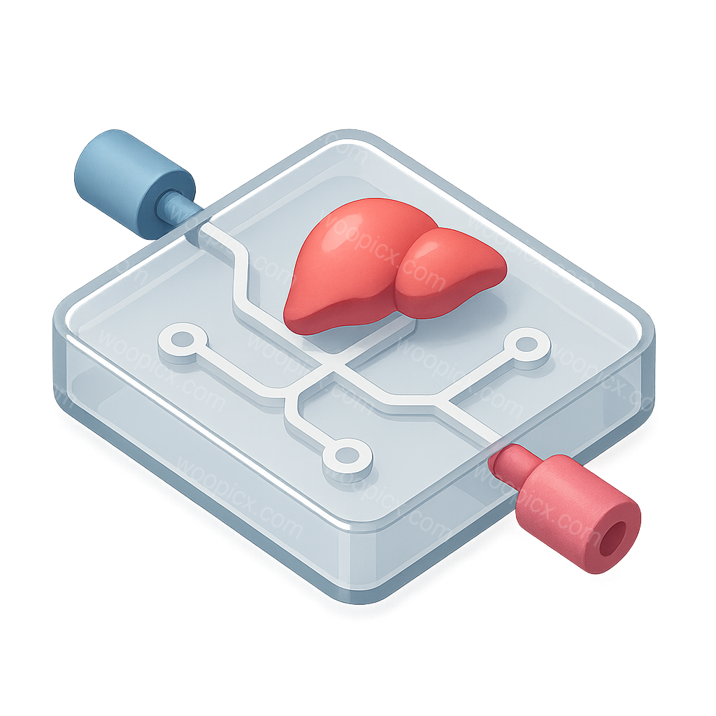 This image features a 3D organ-on-chip device icon, showing a stylized liver on a transparent chip. The design has a three-quarter view, enhancing its volumetric and isometric appearance.