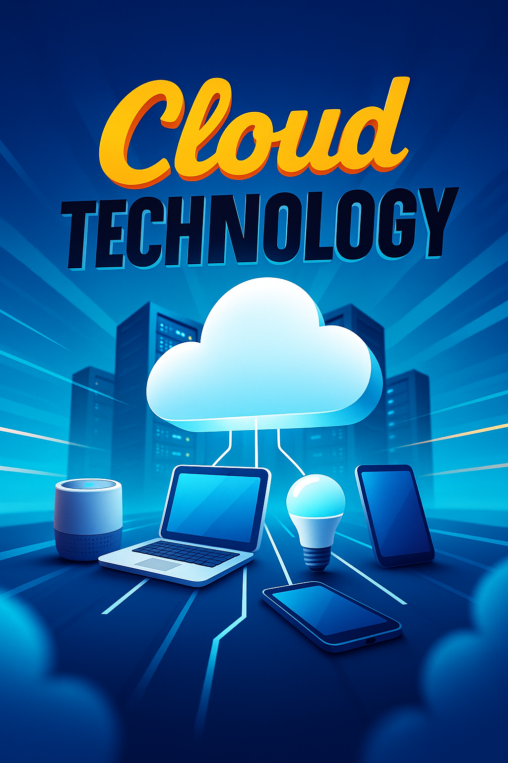 /Collection: /by davooda/Type: PNG/A vibrant illustration showcasing cloud technology. Devices like a laptop, tablet, and smart home gadgets connect through a stylized cloud, set against a dynamic blue gradient background.