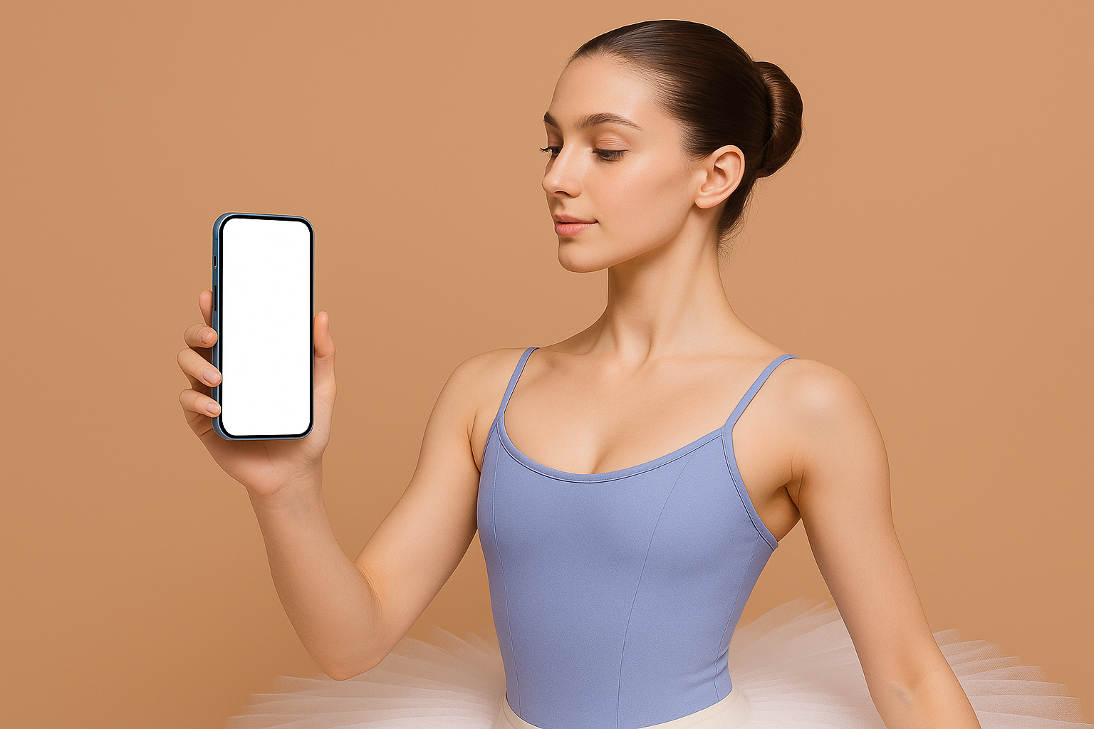 A graceful ballerina in a light blue leotard and fluffy white tutu elegantly holds a phone with a blank screen. The background is a warm, neutral tone, enhancing her poised stance.