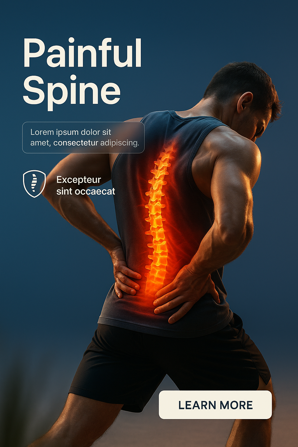 This image features a health-related graphic highlighting spine pain, ideal for educational or promotional use in medical contexts. The design is modern and impactful.