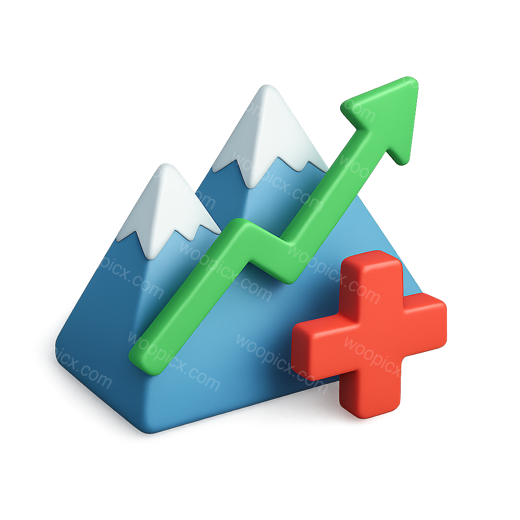 /Premium/Collection: /by davooda/Type: PNG/A vibrant 3D isometric illustration featuring two stylized mountains with snow caps, an upward graph line, and a red plus symbol, all set against a dark background.