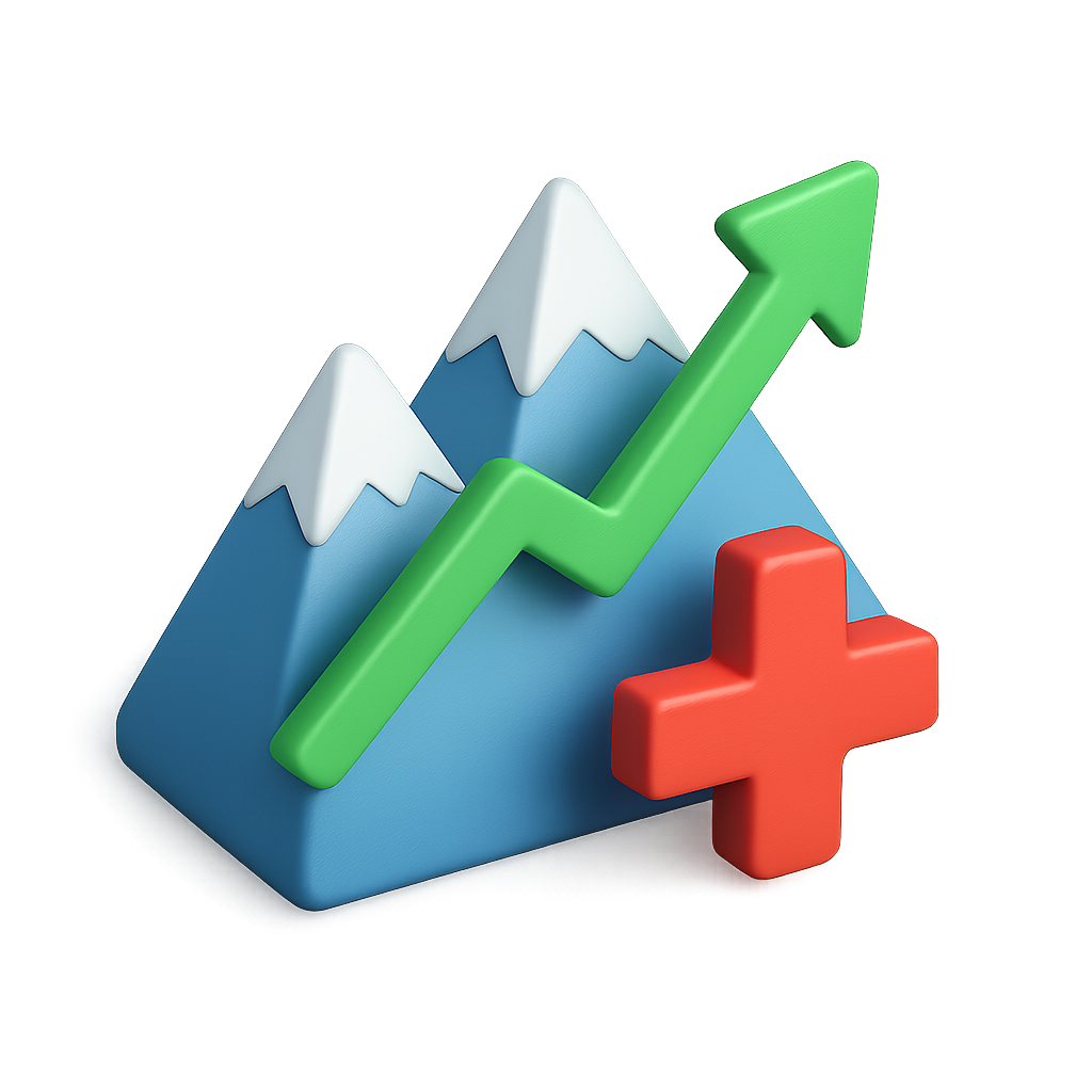 /Collection: /by davooda/Type: PNG/A vibrant 3D isometric illustration featuring two stylized mountains with snow caps, an upward graph line, and a red plus symbol, all set against a dark background.