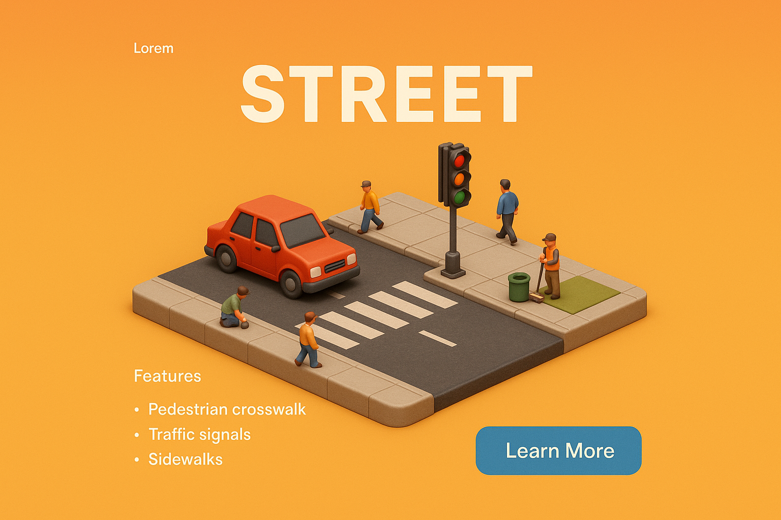 /Collection: /by davooda/Type: PNG/A vibrant 3D scene depicting a street with pedestrians, a red car, and traffic signals. The design features a smooth gradient background, highlighting the street elements in a playful yet realistic style.