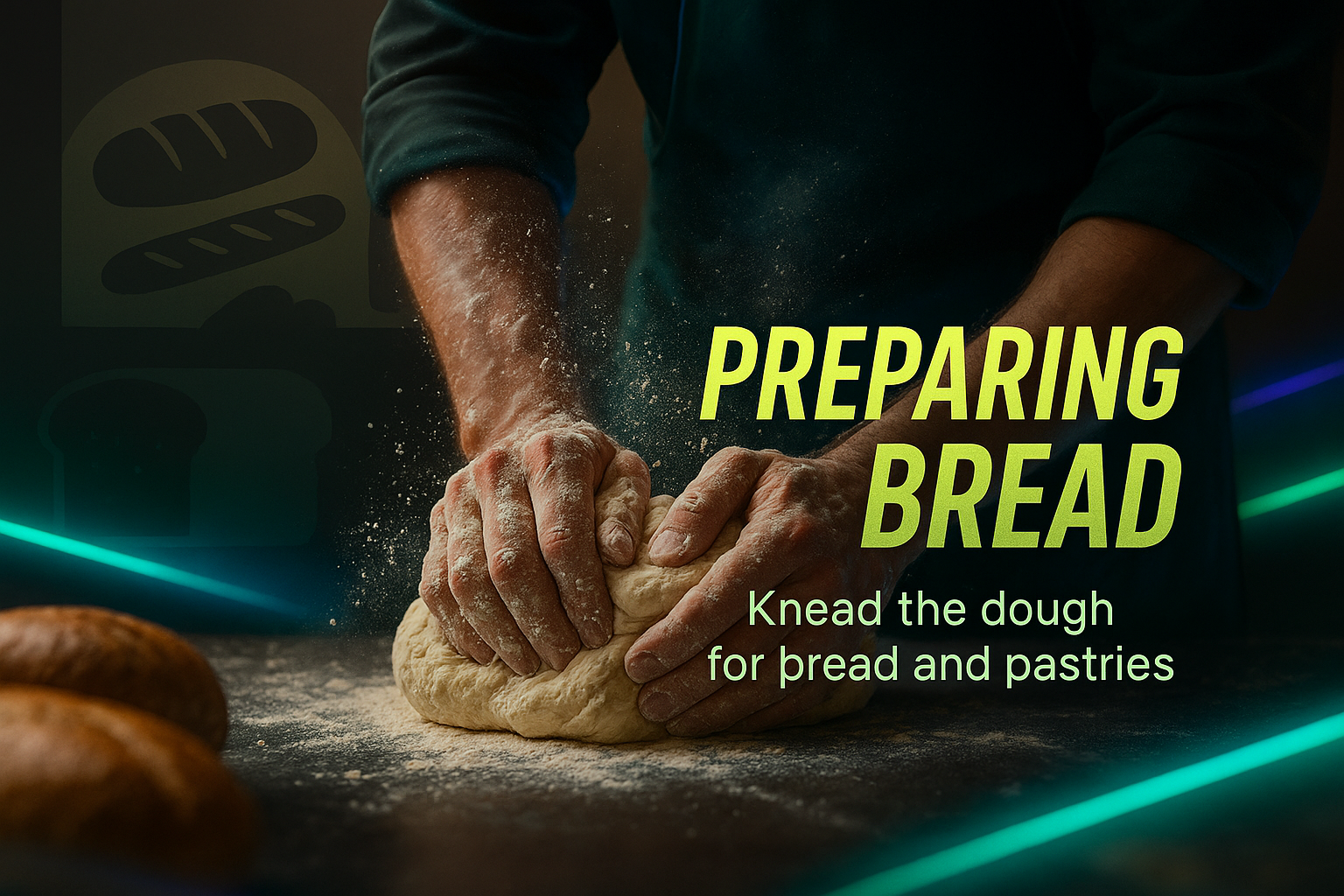 /Collection: /by davooda/Type: PNG/A visually appealing image showcasing the process of kneading dough for bread and pastries. The warm lighting and dynamic composition highlight the artisan craft of baking, making it ideal for culinary blogs or cooking tutorials.