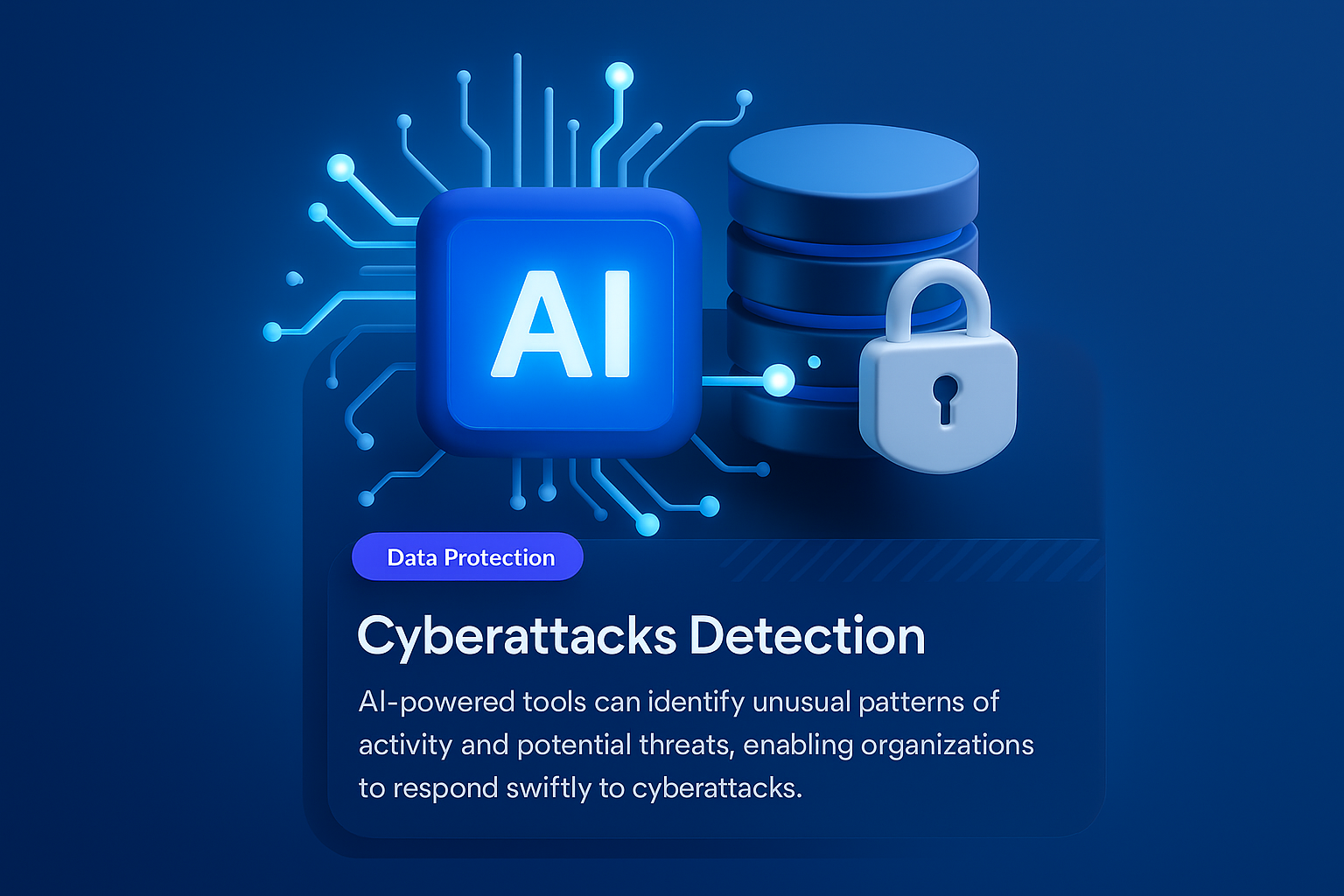/Collection: /by davooda/Type: PNG/A visually appealing 3D illustration showcasing cybersecurity with AI elements, featuring a lock and database against a gradient blue background. The design emphasizes data protection and cyberattack detection.