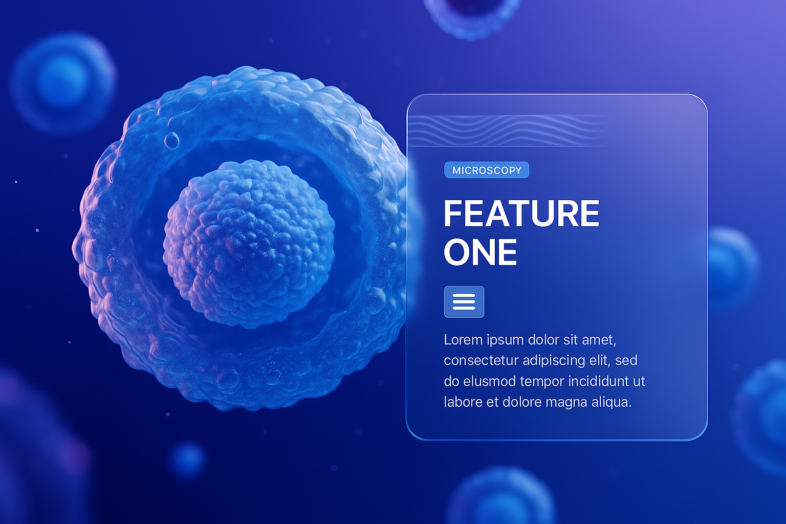 A detailed 3D rendering of a human cell surrounded by a gradient background. Features an informational block with a title and text, designed for web display.