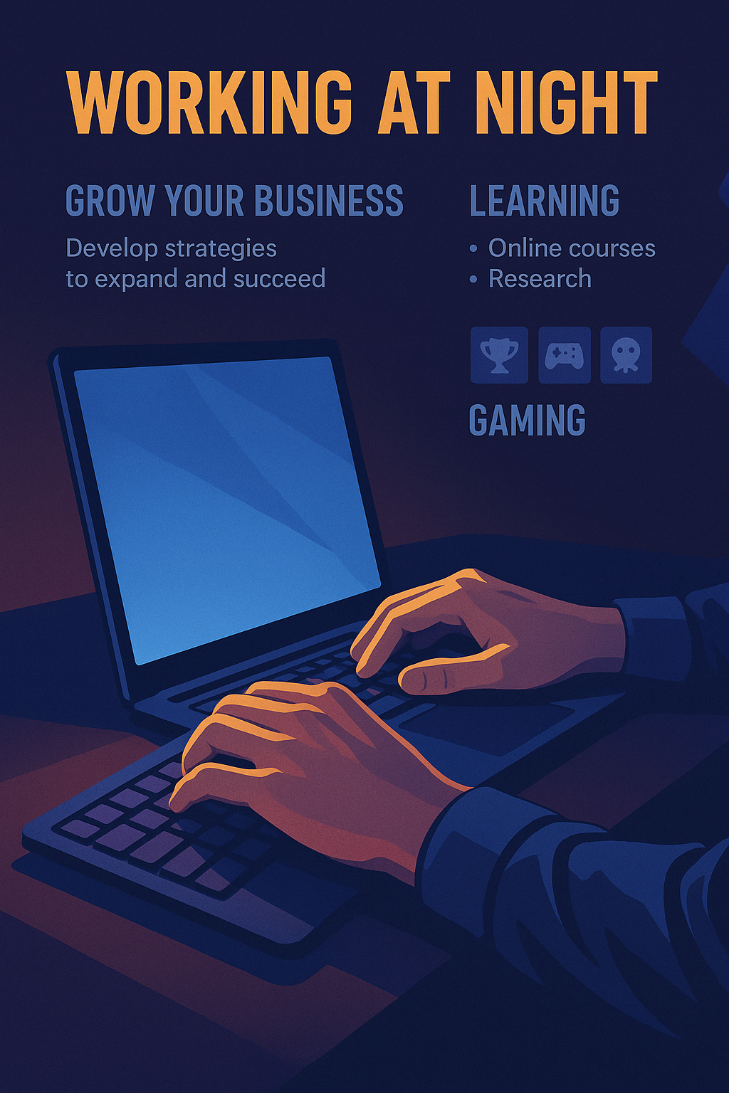 /Collection: /by davooda/Type: PNG/A digital illustration depicting hands typing on a laptop at night, emphasizing themes of learning, business growth, and gaming. The modern design targets professionals and students.