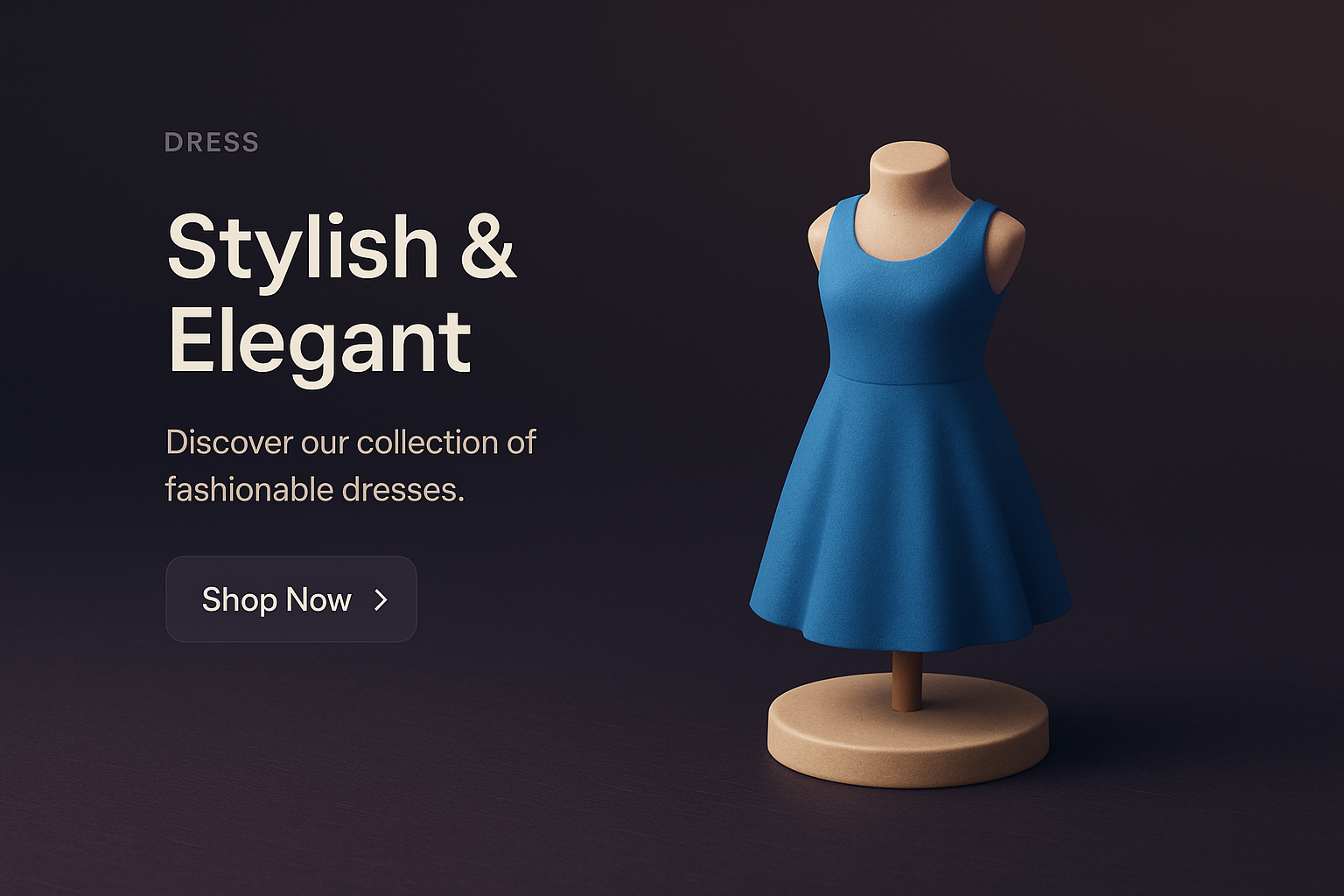 This image showcases a realistic 3D rendering of a stylish blue dress on a wooden mannequin. The dark gradient background enhances the dress's vibrant color, complemented by a clear call-to-action button.
