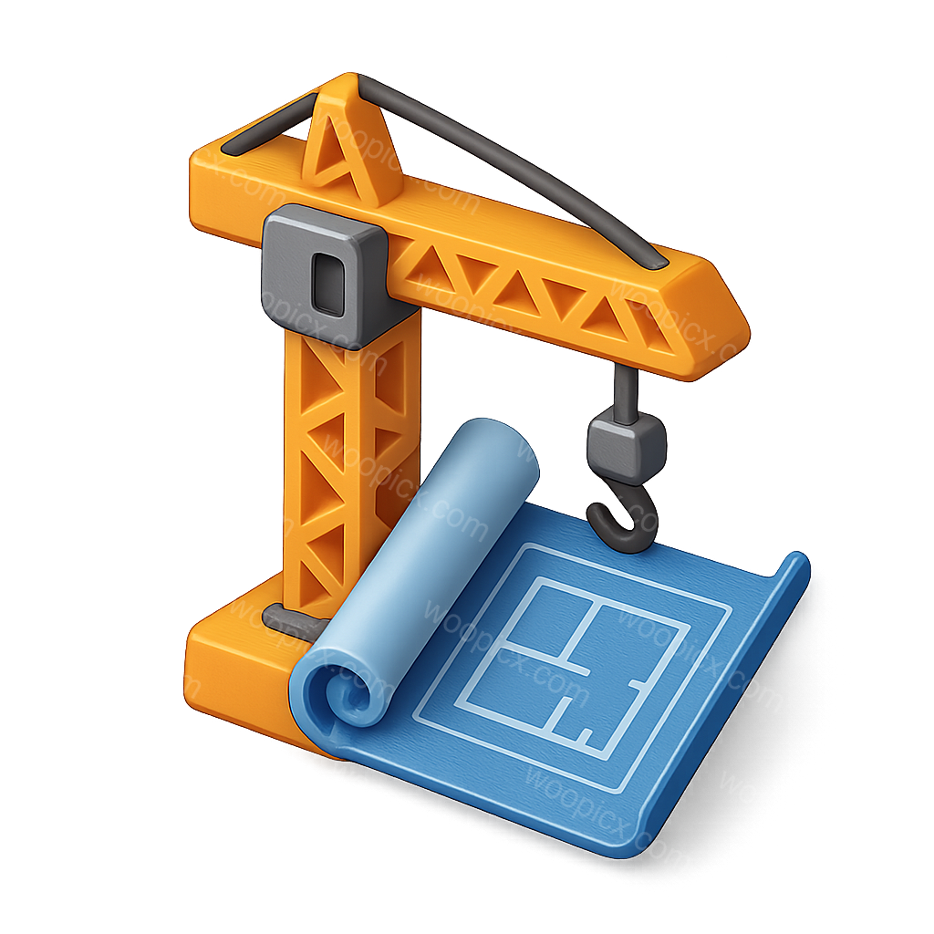 /Premium/Collection: /by davooda/Type: PNG/A vibrant 3D illustration of a construction crane beside a rolled-up blueprint. The crane features a bright orange color, showcasing its detailed structure and a hook, while the blueprint is depicted in blue with clear architectural lines.