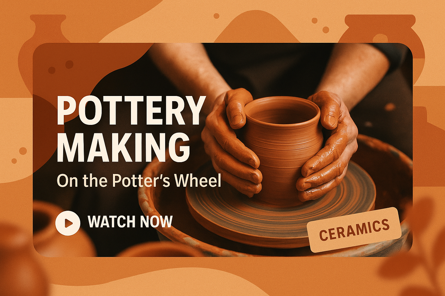 Vibrant video thumbnail showcasing pottery making with hands shaping clay on a wheel, ideal for promoting ceramic tutorials and crafting content.