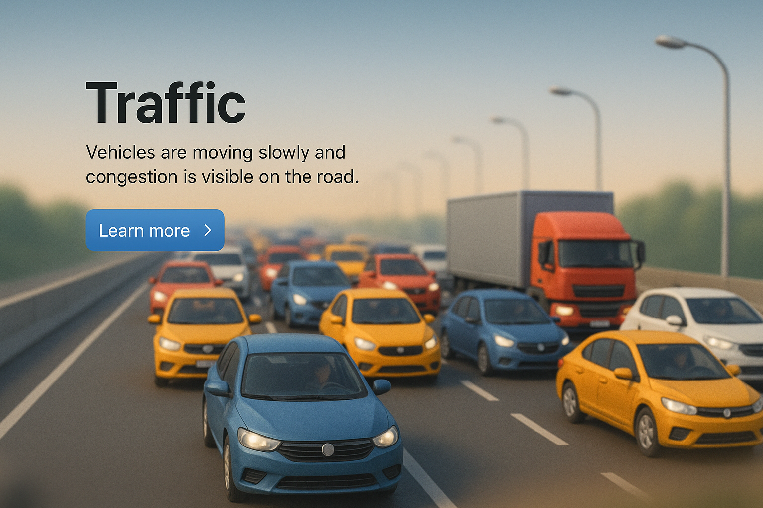 /Collection: /by davooda/Type: PNG/A zoomed-out 3D illustration depicting a traffic scene with colorful vehicles. The background features a smooth gradient, while a text block and action button enhance the visual appeal.