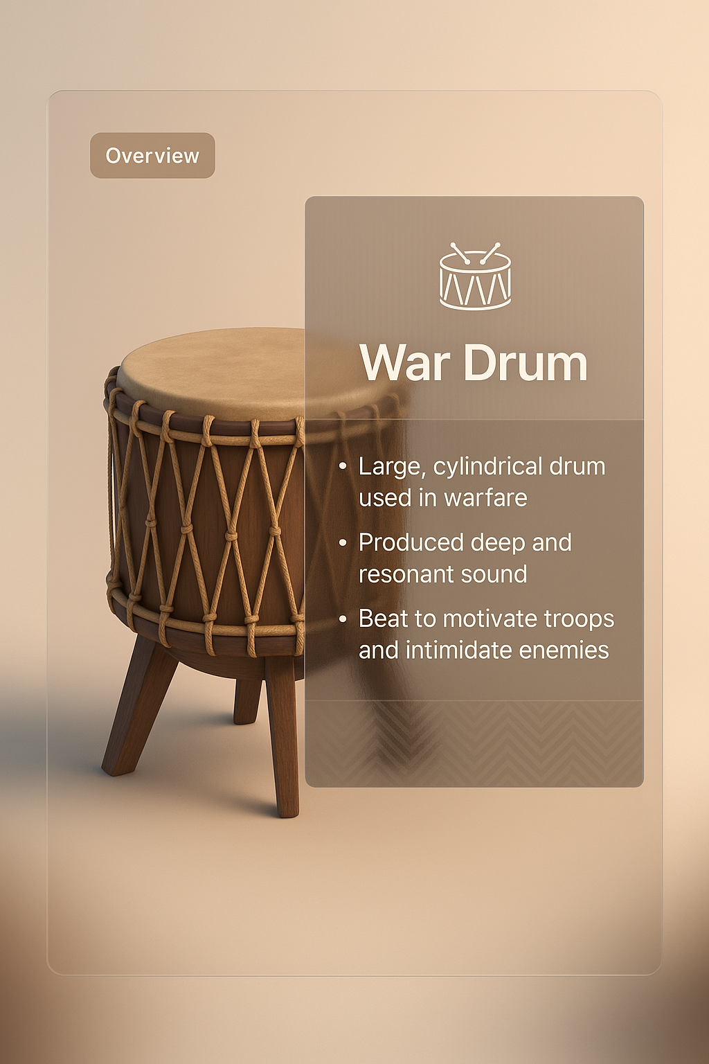 A 3D illustration of a war drum, featuring a soft gradient background. The design includes an overview block with a title, icon, and text, effectively integrated with a subtle transparency effect.