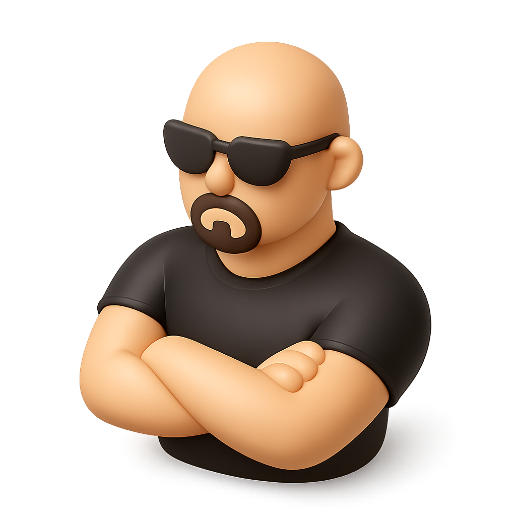 A stylized 3D bouncer figure with a bald head and sunglasses, depicted in a three-quarter view. The character has crossed arms and a confident stance, presenting a bold and modern aesthetic.