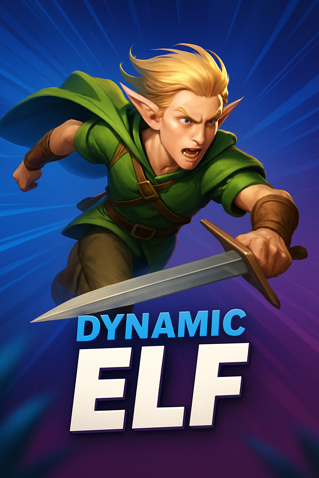 A striking image of a dynamic elf character wielding a sword, captured in a vibrant, action-packed scene. The background features a gradient of deep colors enhancing the sense of motion.