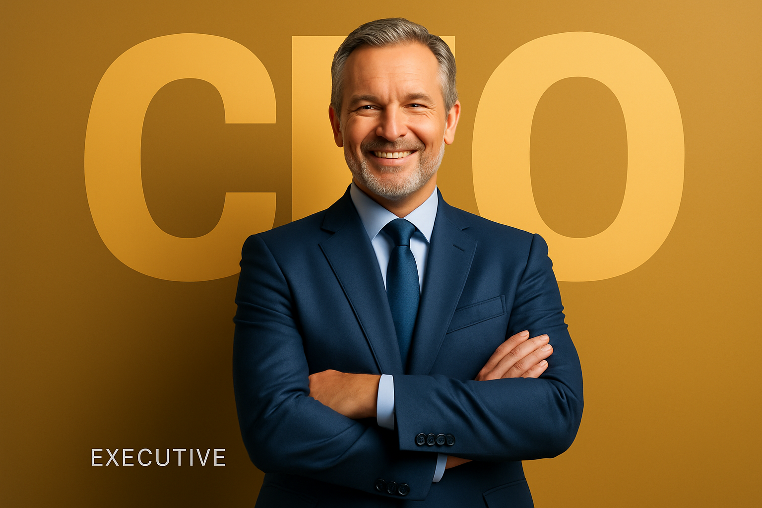 /Collection: /by davooda/Type: PNG/A smiling middle-aged businessman stands confidently in a blue suit with arms crossed in front of a bold 'CEO' backdrop. The design is modern and minimalistic, highlighting his professional demeanor.