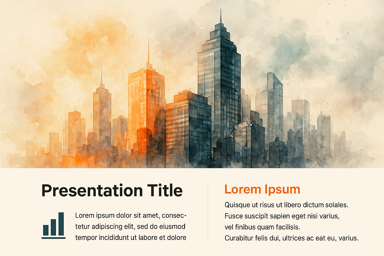 A visually appealing presentation template featuring a watercolor cityscape background. Ideal for business presentations, showcasing urban themes with a modern artistic flair.