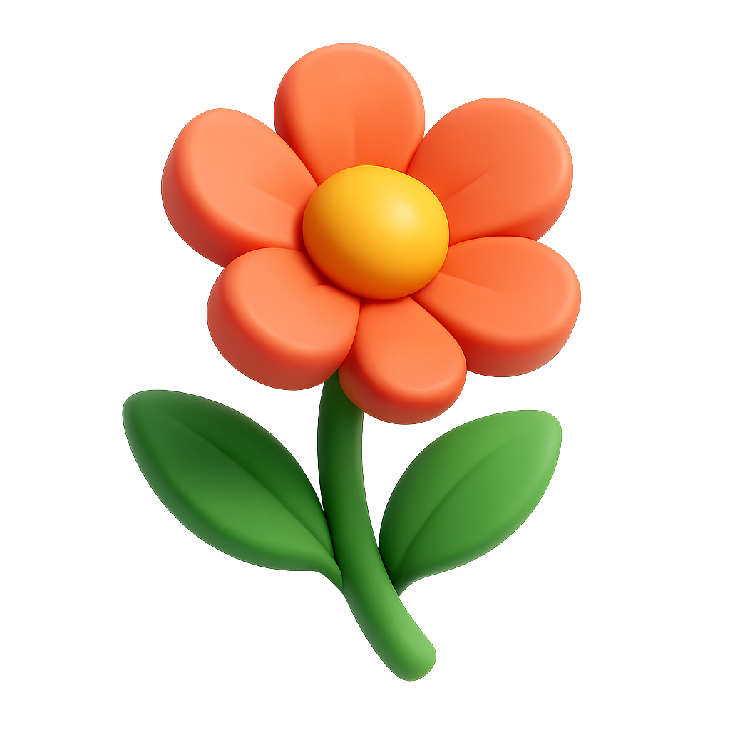 /Collection: /by davooda/Type: PNG/A colorful 3D icon of a flower featuring orange petals, a yellow center, and green leaves, displayed in a three-quarter view with a smooth, volumetric appearance.