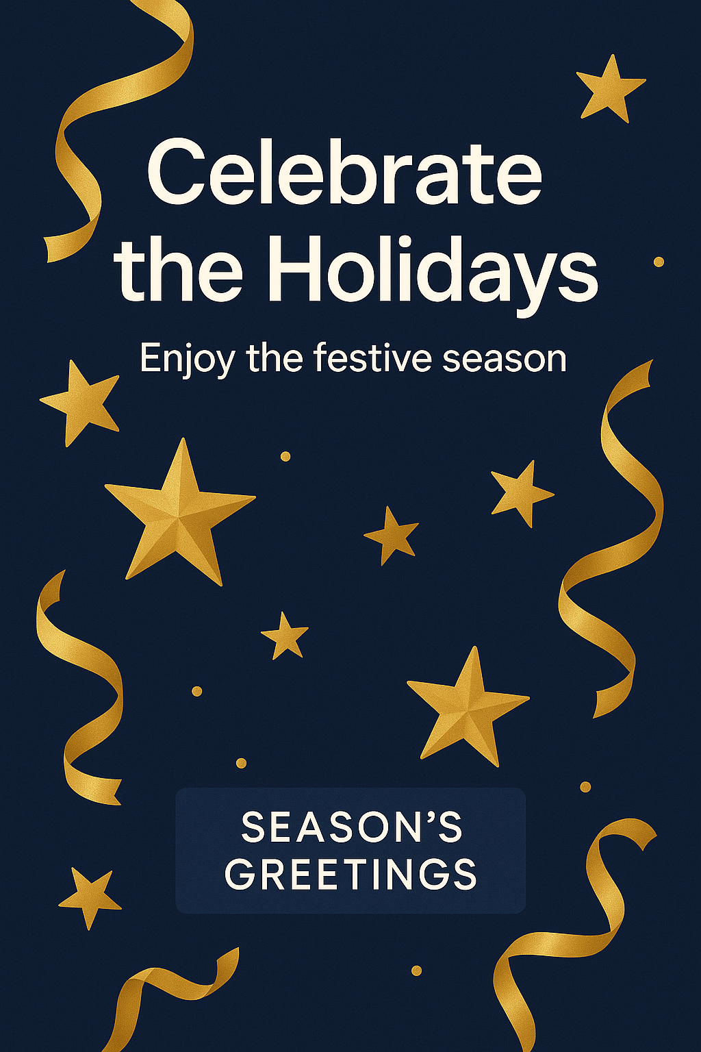 A visually appealing holiday greeting card featuring gold stars and ribbons on a dark background, perfect for seasonal celebrations and festive promotions.