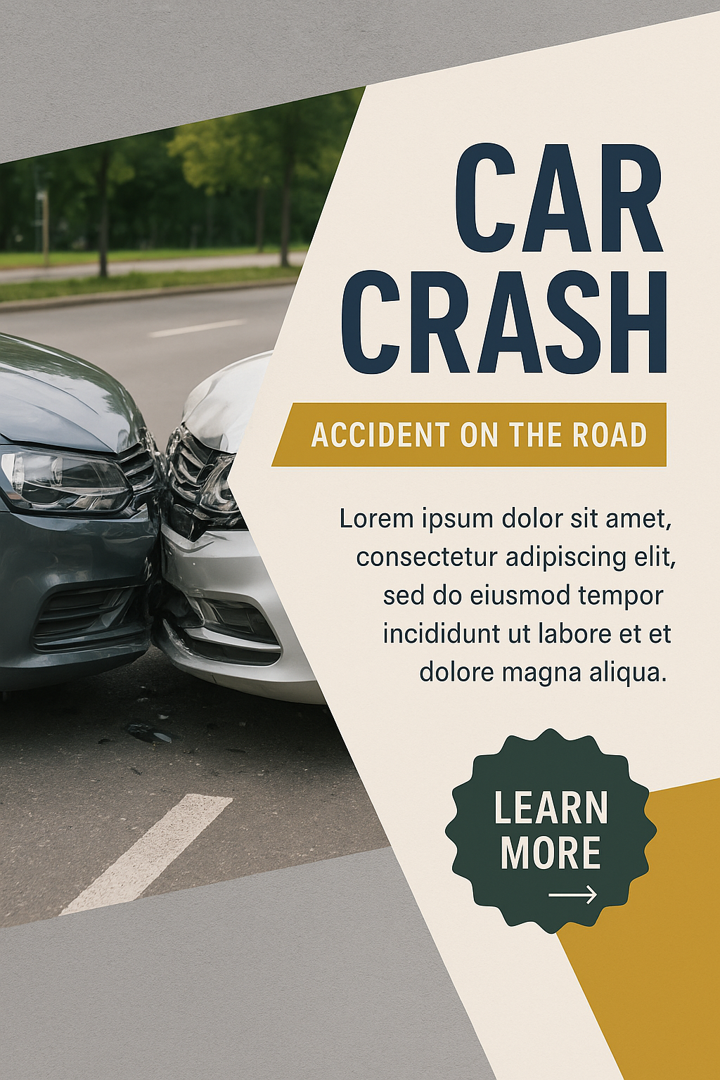 A realistic depiction of a car crash on the road, featuring a banner for information. The composition includes a clear title and a call-to-action button for engagement.