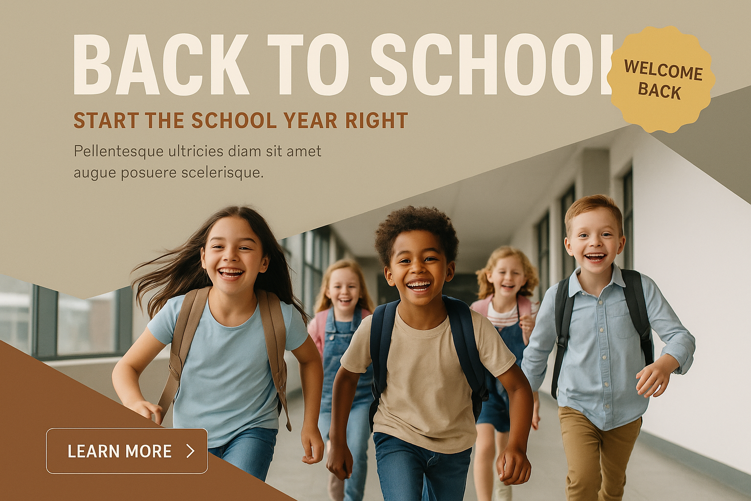 /Collection: /by davooda/Type: PNG/A vibrant scene of cheerful children running through a school corridor, embodying the excitement of returning to school. The design features a welcoming theme with engaging colors.