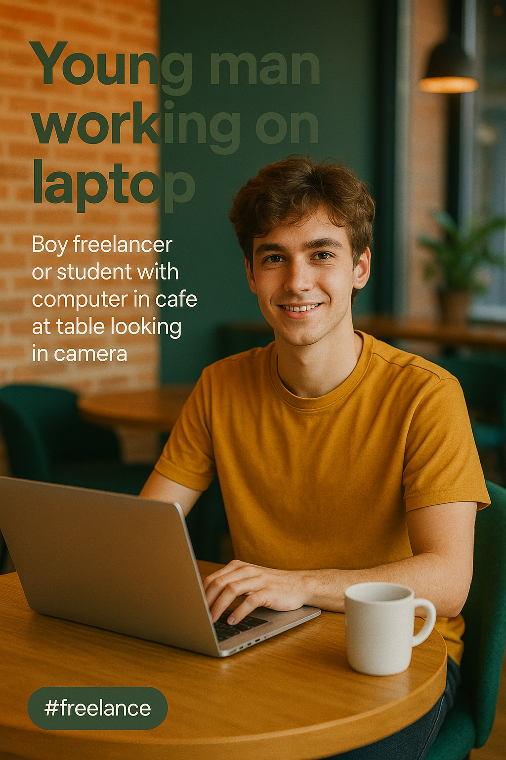A casual portrait of a young man working on a laptop in a cozy cafe setting. Ideal for freelance or student-related themes, showcasing a relaxed work environment.