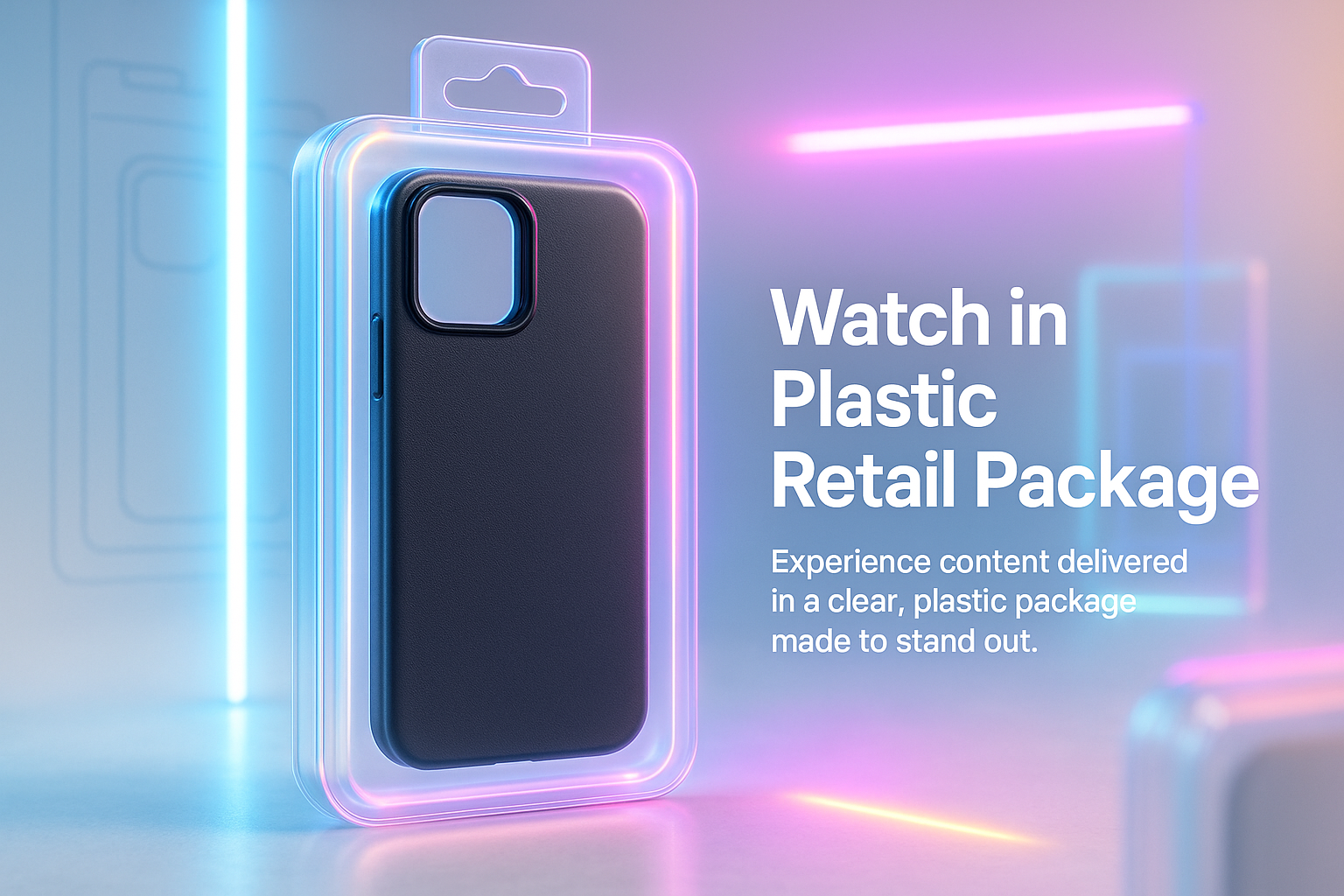 /Collection: /by davooda/Type: PNG/Stylish product packaging image featuring a smartphone case in a transparent retail package, enhanced with neon lighting effects, ideal for e-commerce and marketing.