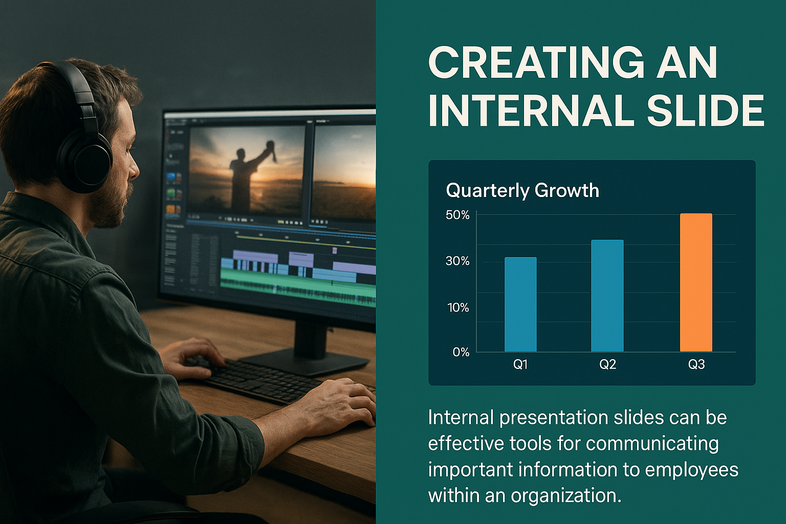 /Collection: /by davooda/Type: PNG/Visual representation of an internal presentation slide, featuring a person working on video editing with a graphical chart showing quarterly growth. Ideal for corporate training materials.