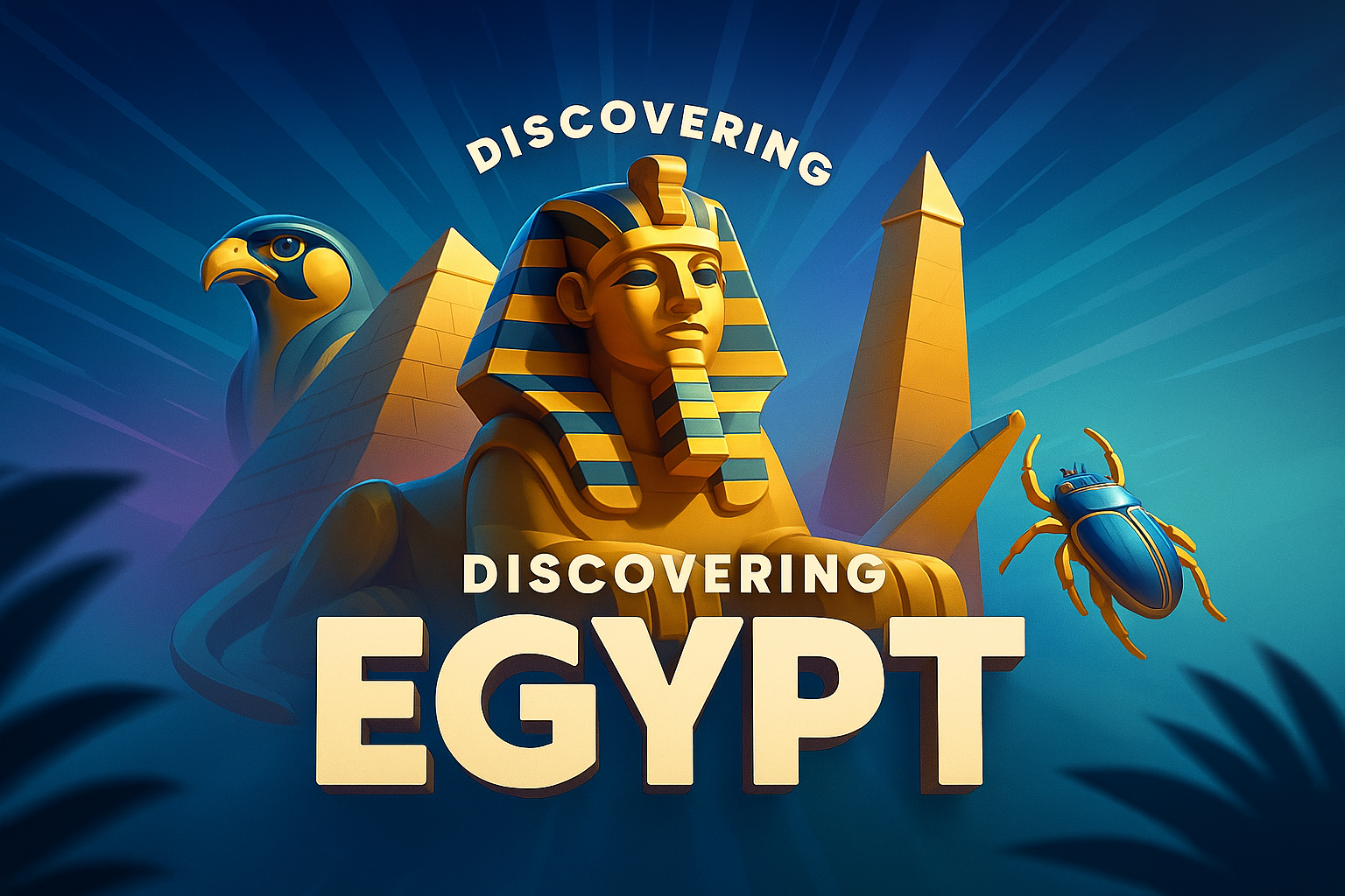 /Collection: /by davooda/Type: PNG/A vibrant and dynamic illustration showcasing iconic Egyptian symbols like the Sphinx, pyramids, and scarab. The design features bold typography and a rich color palette, creating an engaging visual experience.