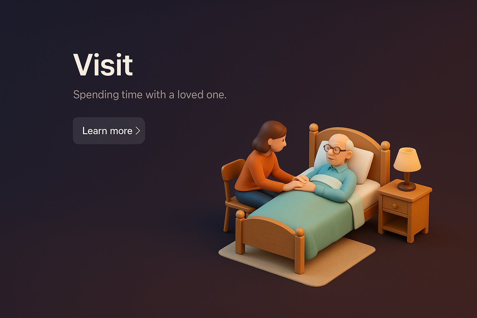 A heartfelt 3D scene showing a person visiting an elderly individual in bed. The background is dark, emphasizing the warm colors of the characters and setting.