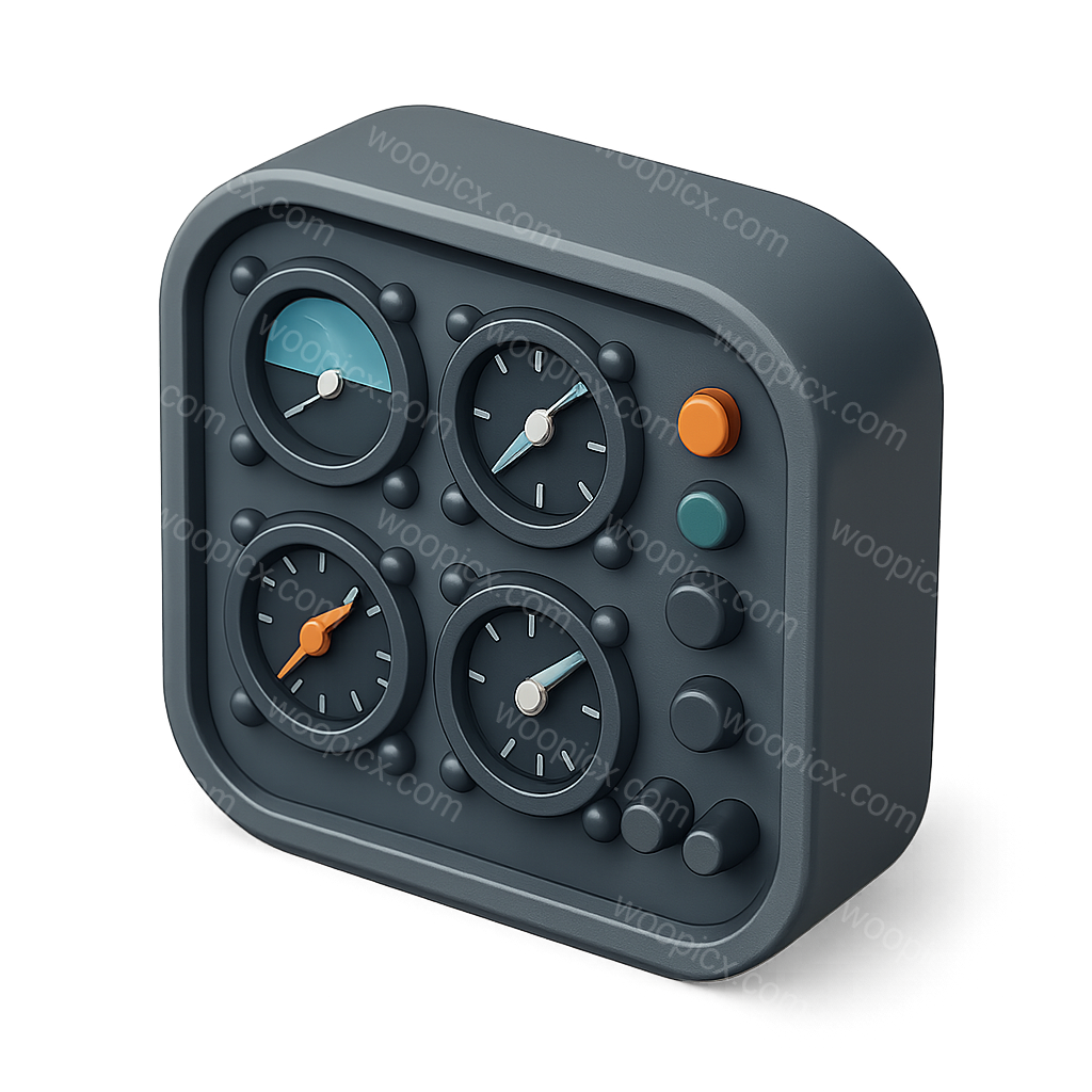 /Premium/Collection: /by davooda/Type: PNG/A three-dimensional icon of a cockpit instrument panel, featuring four gauges and control knobs. The design is isometric with a transparent background, enhancing its volumetric appearance.