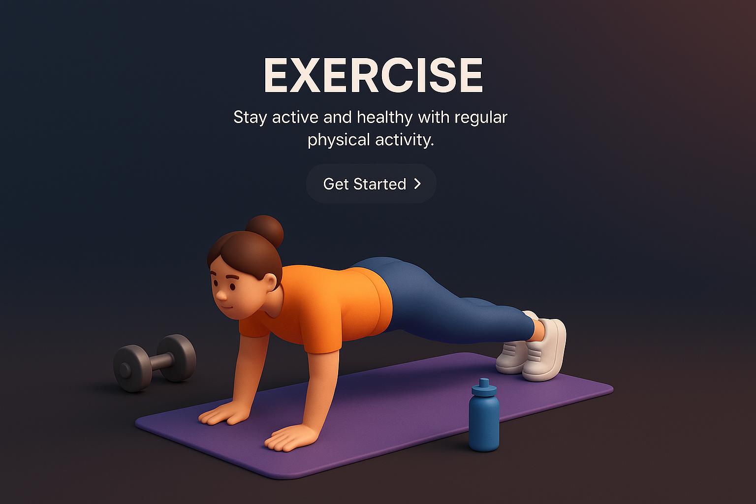 /Collection: /by davooda/Type: PNG/A visually appealing 3D illustration depicting a person exercising in a dark gradient background. The scene features a push-up position, with vibrant colors and clear text elements for an engaging user experience.