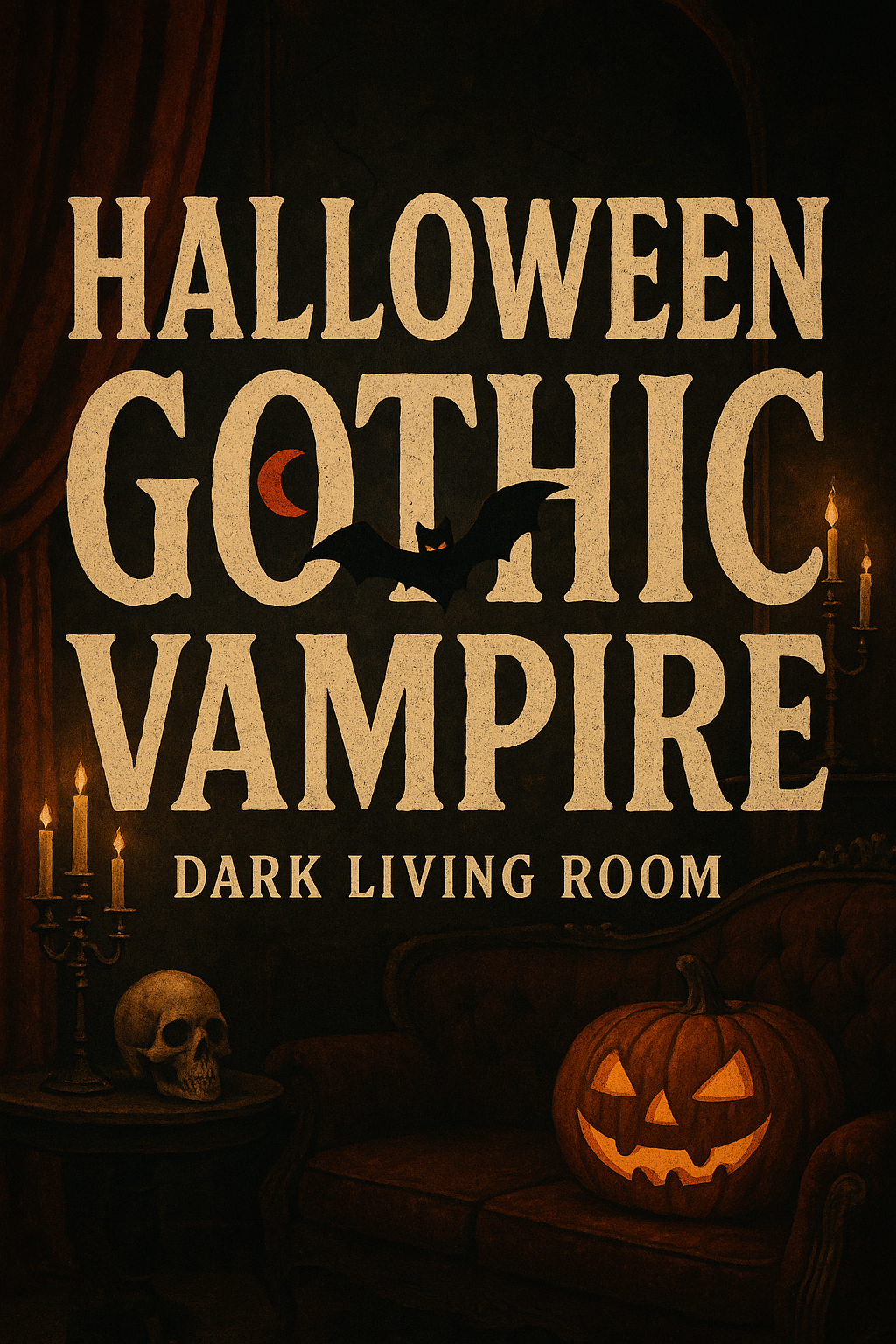 A visually striking Halloween-themed illustration depicting a dark living room with gothic elements, perfect for seasonal decoration or event promotion.
