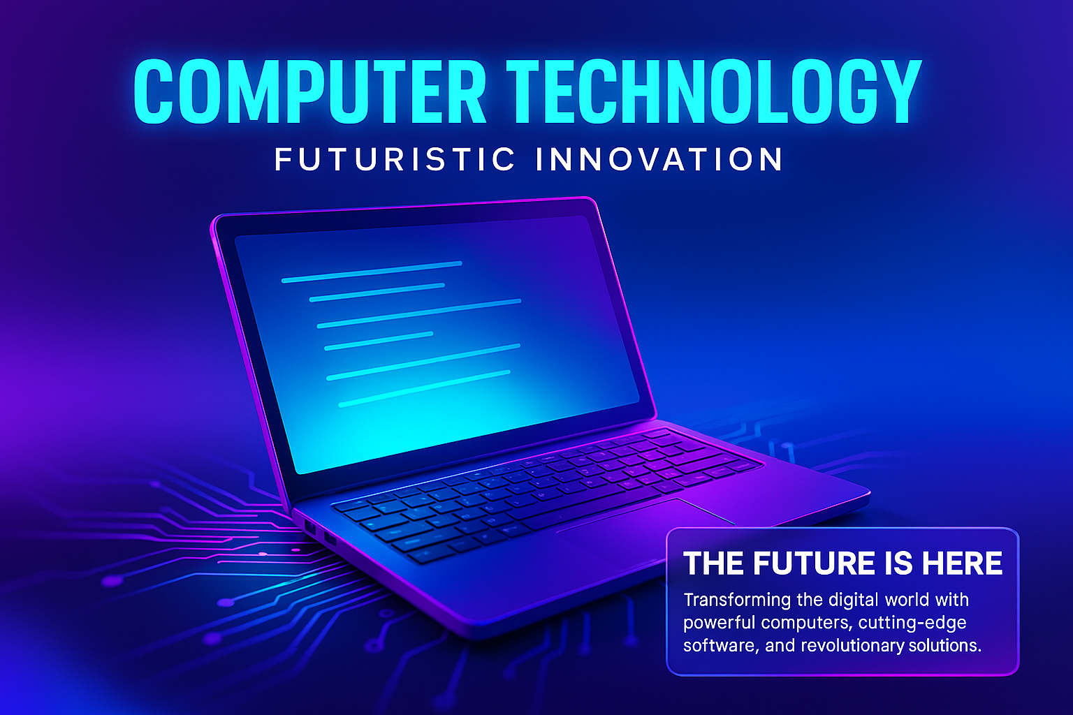 /Collection: /by davooda/Type: PNG/A vibrant illustration showcasing a laptop with glowing elements, symbolizing futuristic computer technology. The design features a smooth gradient background and engaging typography.