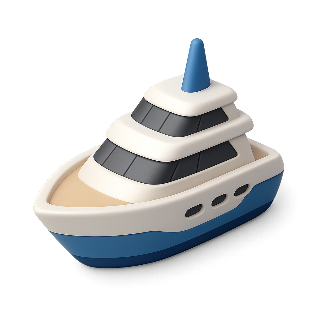 A visually appealing 3D yacht icon presented in a three-quarter view. The yacht features a sleek design with a blue and white color scheme, showcasing its volumetric form against a subtle background.