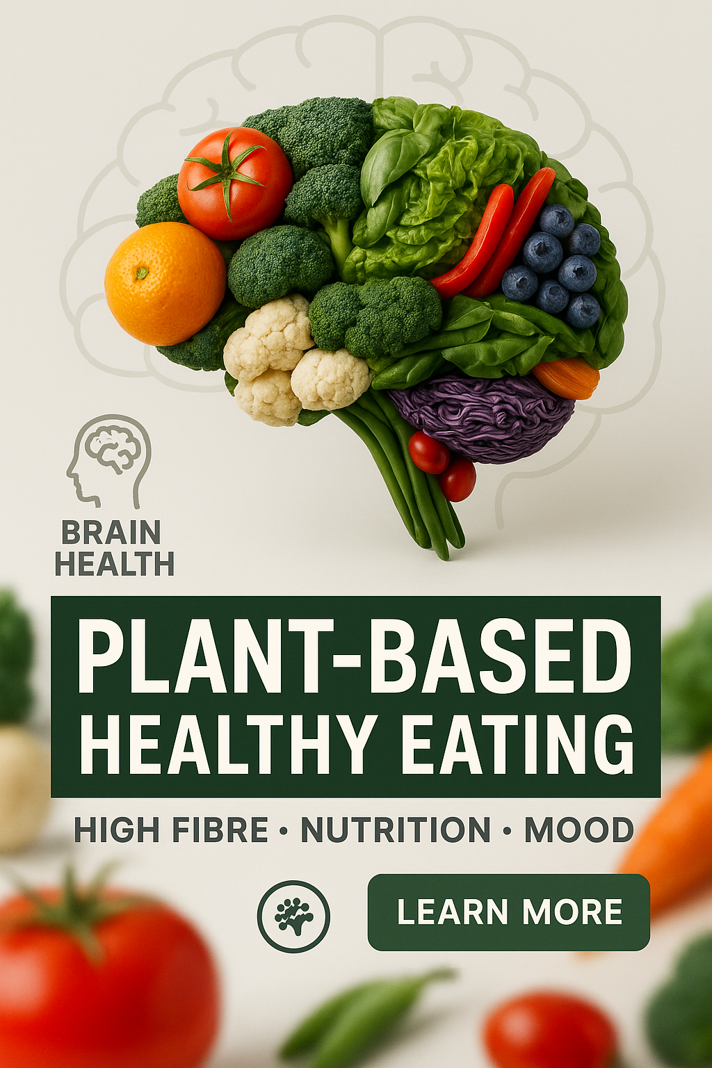 Vibrant and informative graphic highlighting the benefits of plant-based eating with a brain-shaped arrangement of vegetables, ideal for health and wellness campaigns.